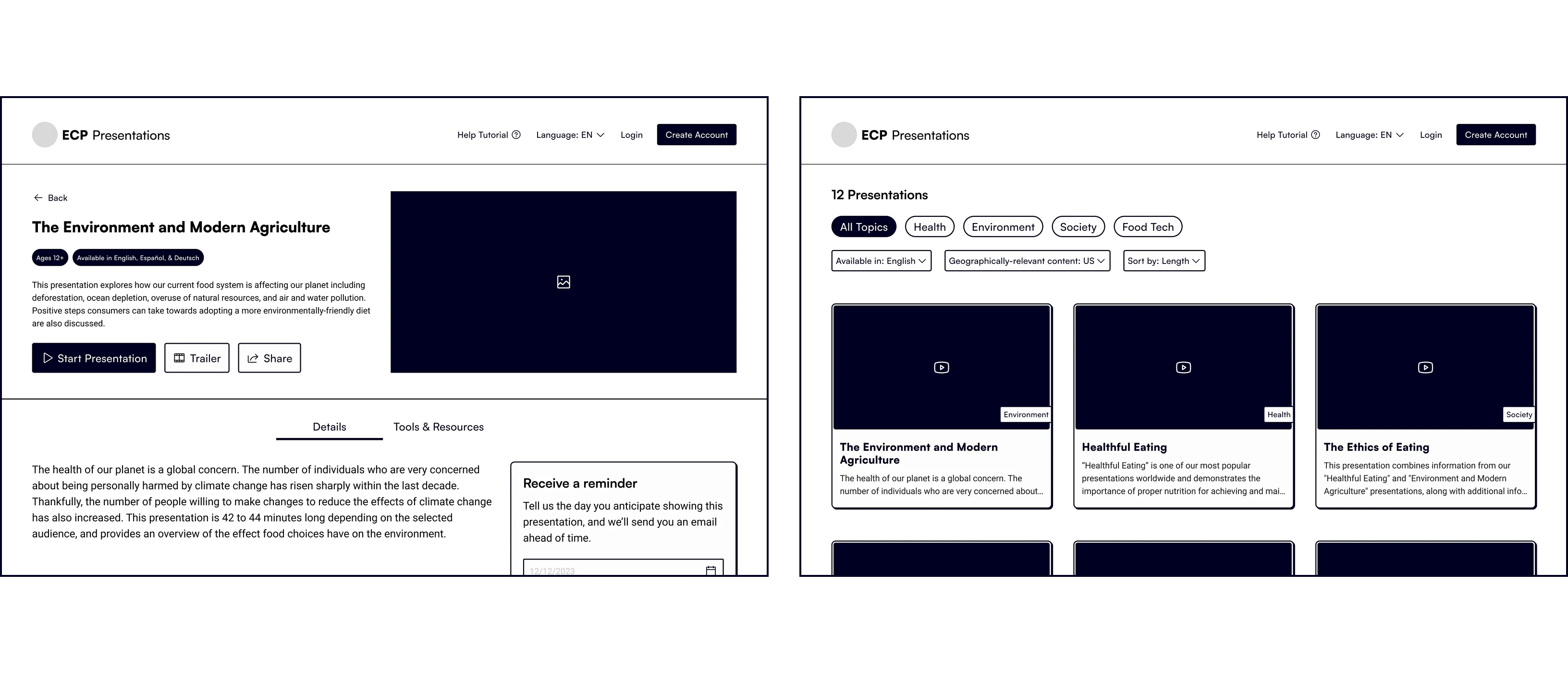 We worked with ECP to transform their curriculum into interactive digital tools. We walked through the user flows of the current journey of accessing and watching a presentation in order to identify the pain-points and drop-off points. Our approach was to create a centralized library of presentations with a simplified onboarding process, giving higher visibility to their wealth of educational information. This eliminated the use of one-time passwords and repetitive requests for access from their loyal user base. This also gave ECP consistent viewership data in order to maintain their reporting capabilities as a nonprofit.